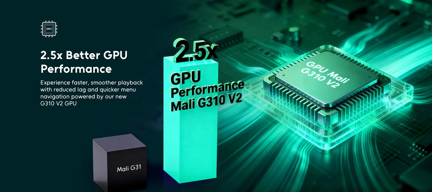 - CPU: Amlogic S905X5M, 64-Bit Quad-Core ARM Cortex-A55 bis 2,5 GHz (≈30.000 DMIPS)